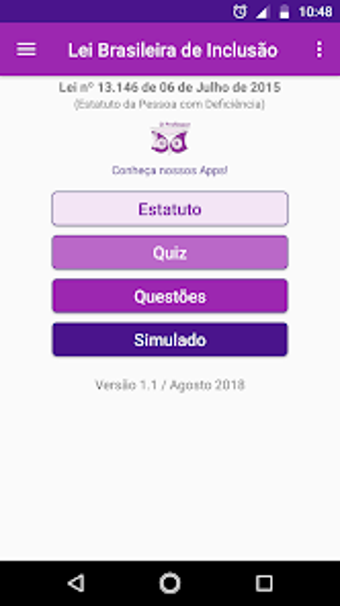 Lei Brasileira de Inclusão är en mobilapplikation som erbjuder användare en omfattande resurs för att studera den brasilianska lagen om inkludering av personer med funktionsnedsättning. Applikationen är särskilt utformad för yrkesverksamma och studenter som förbereder sig för offentliga och privata tävlingar. Den innehåller även information om lagar relaterade till undervisning av LIBRAS (brasiliansk teckenspråk). Med en användarvänlig layout gör appen det möjligt för användare att effektivt organisera sina studier och förbättra sina prestationer i olika prov.